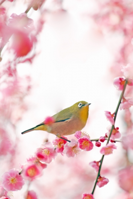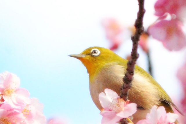 ちなみに、上記の写真ですが、鶯(うぐいす)というとこの鳥だと思っている方が多いそうですが、これは、メジロです。目の回りやおなかが白くなく、鶯色だけの鳥がうぐいすです。